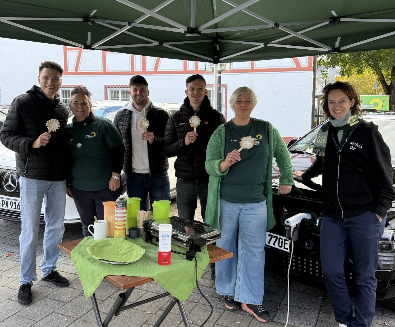 Auch unsere Landtagskandidatin Dr. Mariska Ott war mit ihrem E-Auto vor Ort und hat sich mit Besucher*innen über ihre Erfahrungen ausgetauscht. Das Fahrzeug konnte mit einem besonderen Highlight aufwarten: Elke hat mit dem Strom des Fahrzeugs unsere leckeren Sonnenblumenwaffeln gebacken.