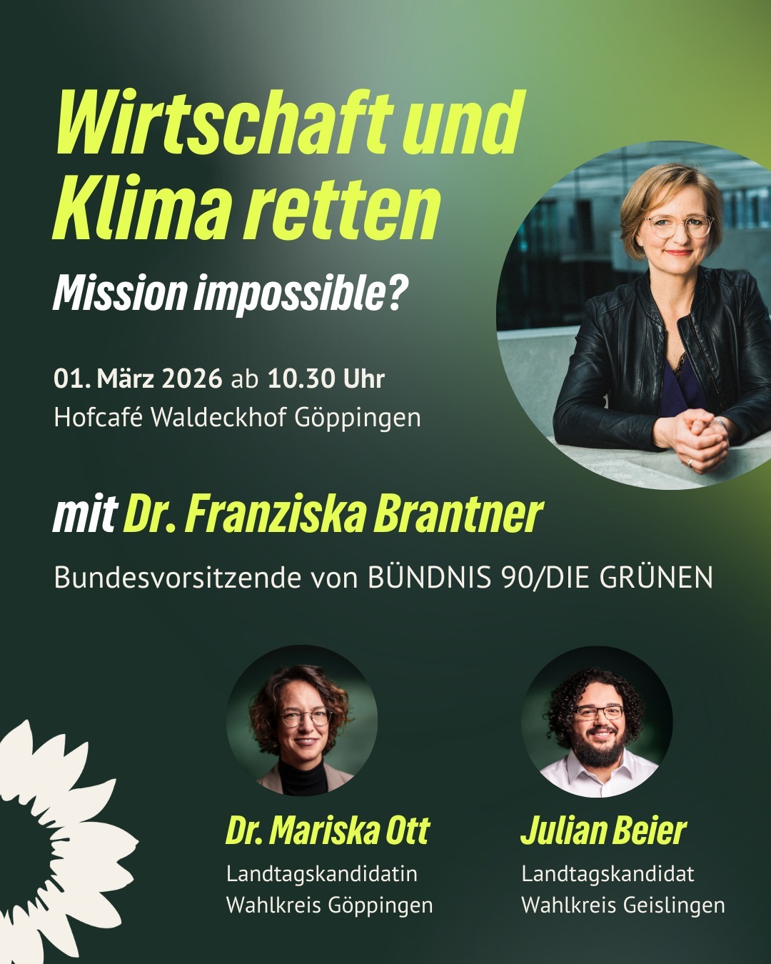 Klimaschutz und wirtschaftliche Stärke sind kein Widerspruch – sondern gehören zusammen. Unter dem Titel „Wirtschaft und Klima retten – Mission impossible?“ laden Dr. Mariska Ott, Landtagskandidatin im Wahlkreis Göppingen, und Julian Beier, Landtagskandidat im Wahlkreis Geislingen, zu einer öffentlichen Diskussion mit Dr. Franziska Brantner, Bundesvorsitzende von BÜNDNIS 90/DIE GRÜNEN und Bundestagsabgeordnete, ein.