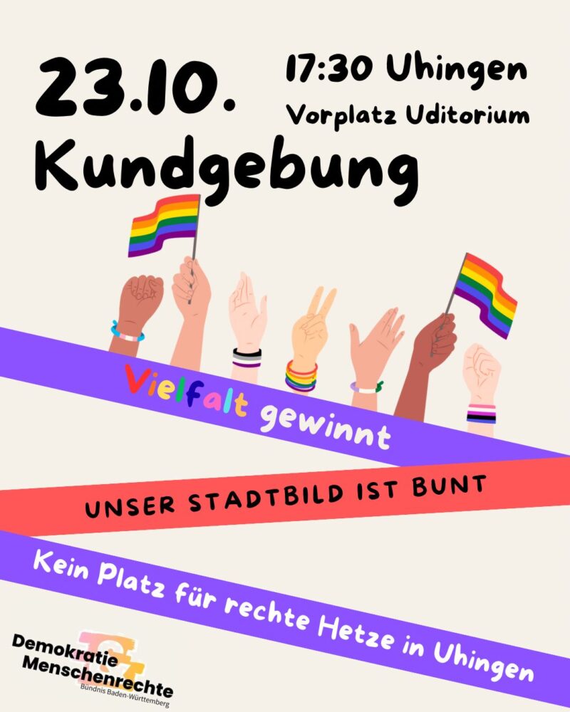 am Donnerstag, den 23. Oktober um 17:30 Uhr veranstaltet unser Ortsverband Uhingen auf dem Vorplatz des Uditoriums die Kundgebung „Vielfalt gewinnt!“.