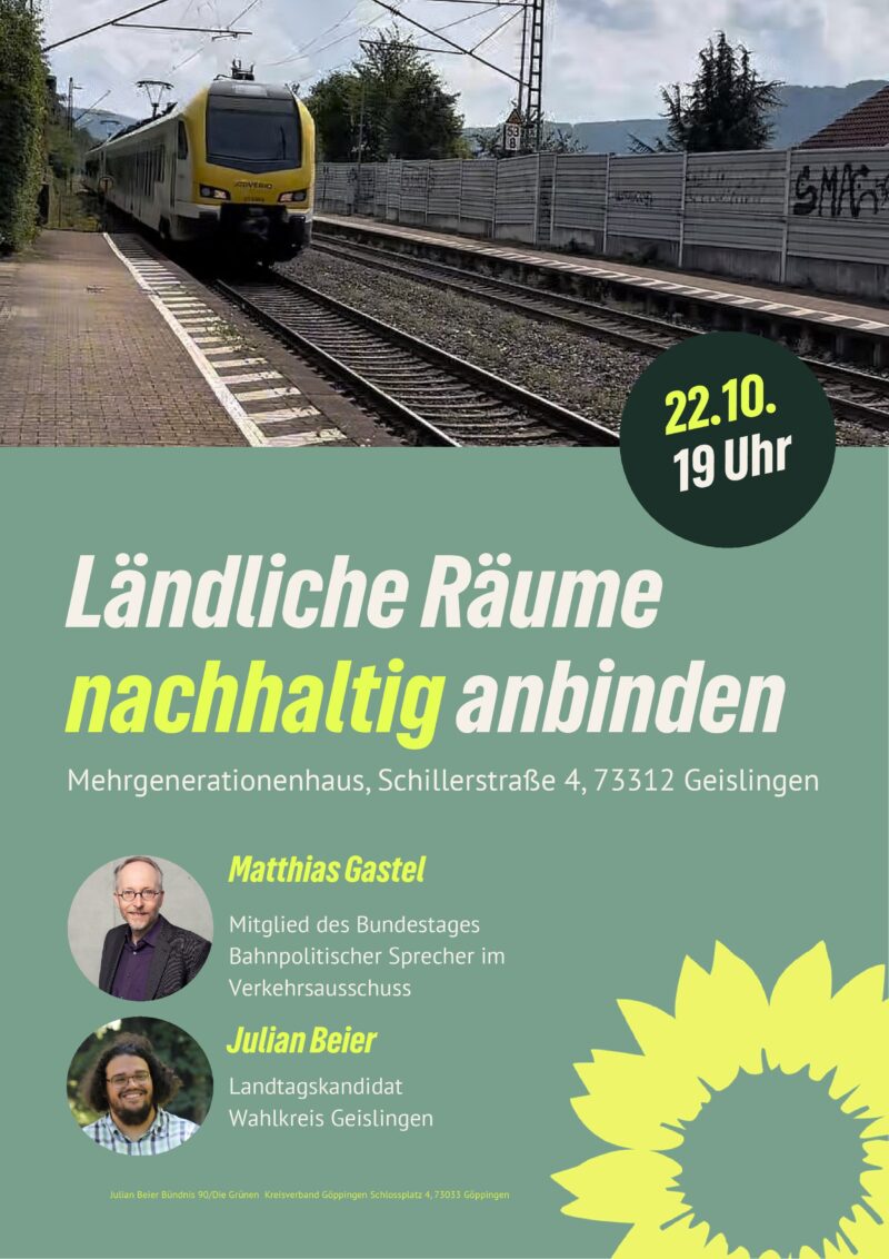 Unter dem Titel „Ländliche Räume nachhaltig anbinden“ veranstalten die Grünen am Mittwoch, 22. Oktober 2025, um 19:00 Uhr im Mehrgenerationenhaus Geislingen (Schillerstraße 4, 73312 Geislingen an der Steige) eine öffentliche Diskussion zur Zukunft des ÖPNV in ländlichen Regionen.