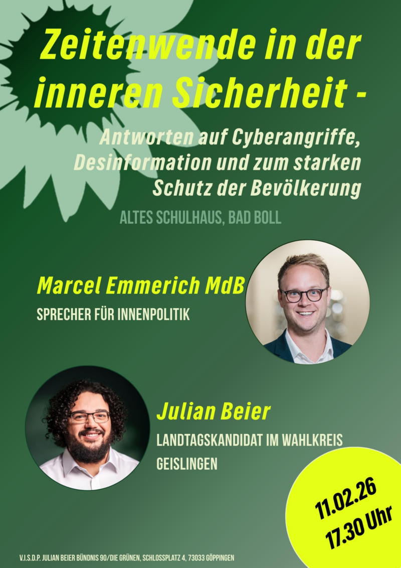 Marcel Emmerich in Zell u.A. (nicht in B.Boll): Innere Sicherheit Mittwoch11.02.202617:30 UhrZell u.A.Download als ics-Datei